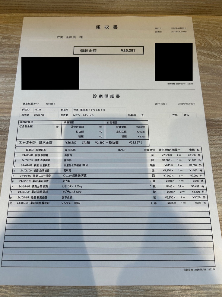 毎日の点滴代・1週間に一度の定期検診代・交通費