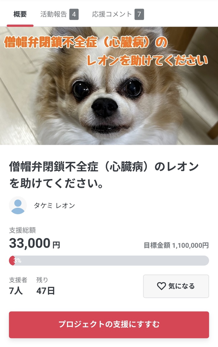 ※代理支援でいただいた支援金は、プロジェクトが不成立になった場合でも、返金せずレオンのこれまでの治療費に充てさせていただきます。