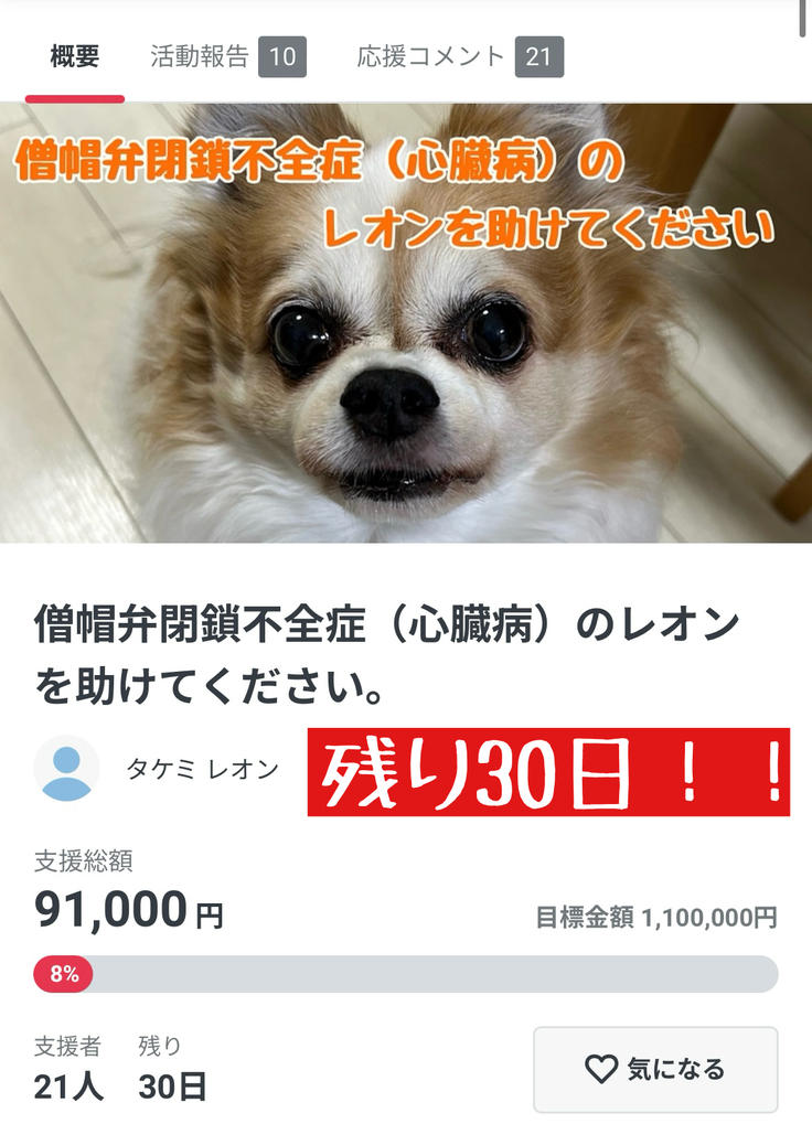 ※代理支援でいただいた支援金は、プロジェクトが不成立になった場合でも、返金せずレオンのこれまでの治療費に充てさせていただきます。