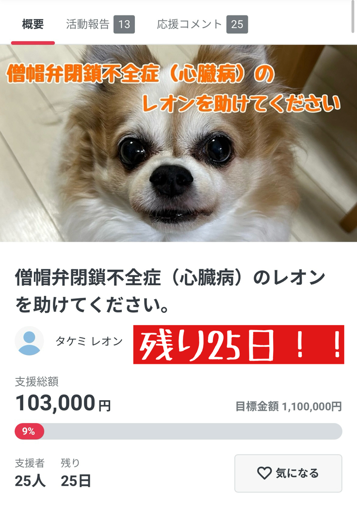 ※代理支援でいただいた支援金は、プロジェクトが不成立になった場合でも、返金せずレオンのこれまでの治療費に充てさせていただきます。