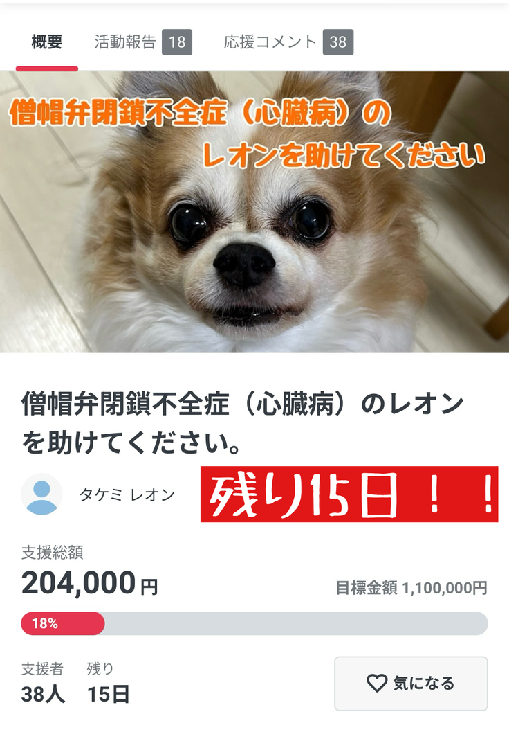 ※代理支援でいただいた支援金は、プロジェクトが不成立になった場合でも、返金せずレオンのこれまでの治療費に充てさせていただきます。