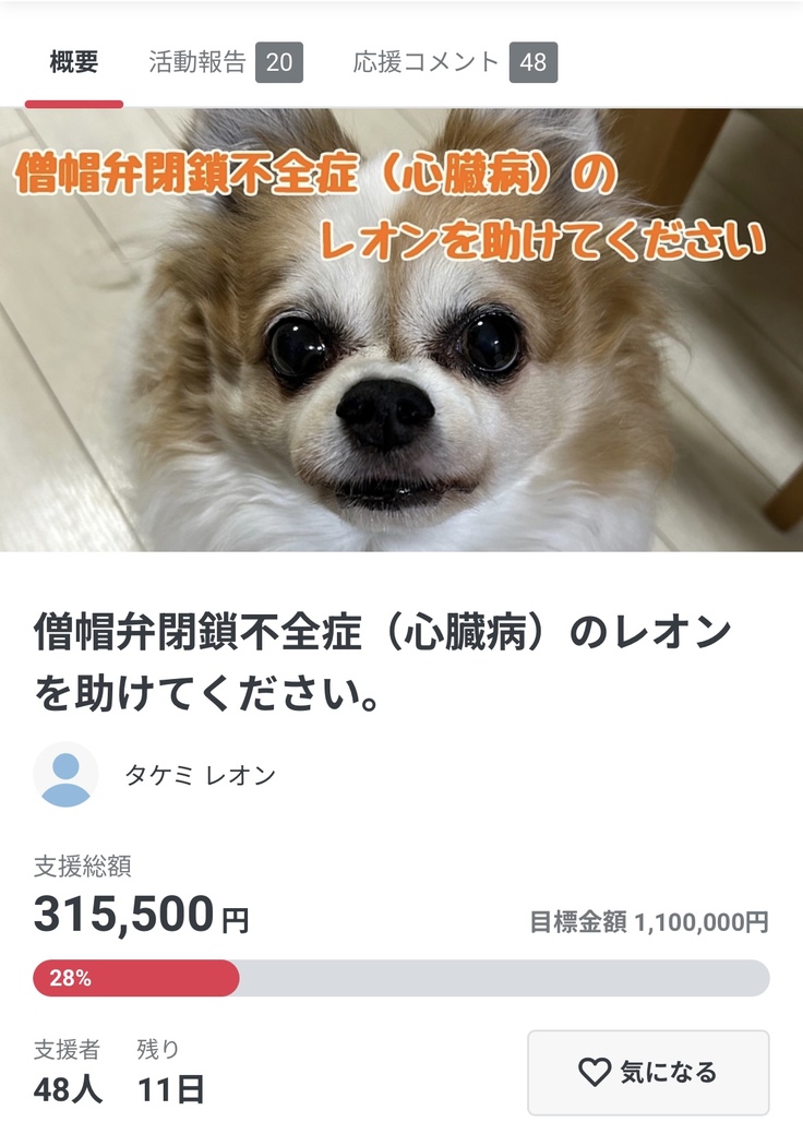 レオンの病状がとても悪く、手術を緊急で行ったこともあり資金に余裕がなく借入れたお金で手術を行いました。