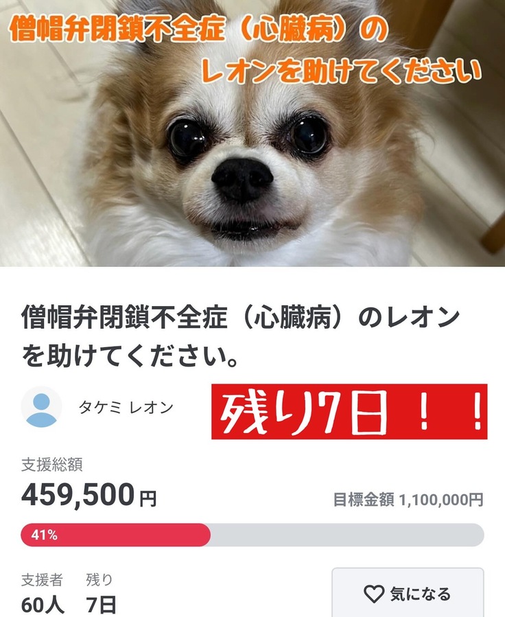 ※代理支援でいただいた支援金は、プロジェクトが不成立になった場合でも、返金せずレオンのこれまでの治療費に充てさせていただきます。
