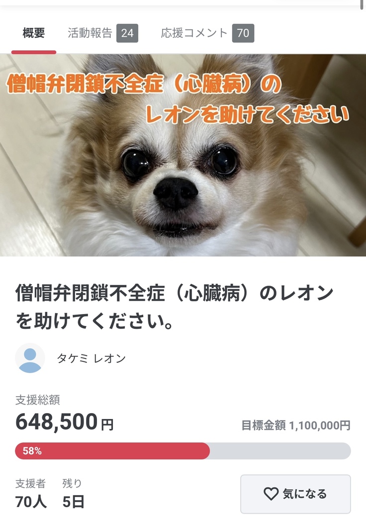レオンの病状がとても悪く、手術を緊急で行ったこともあり資金に余裕がなく借入れたお金で手術を行いました。