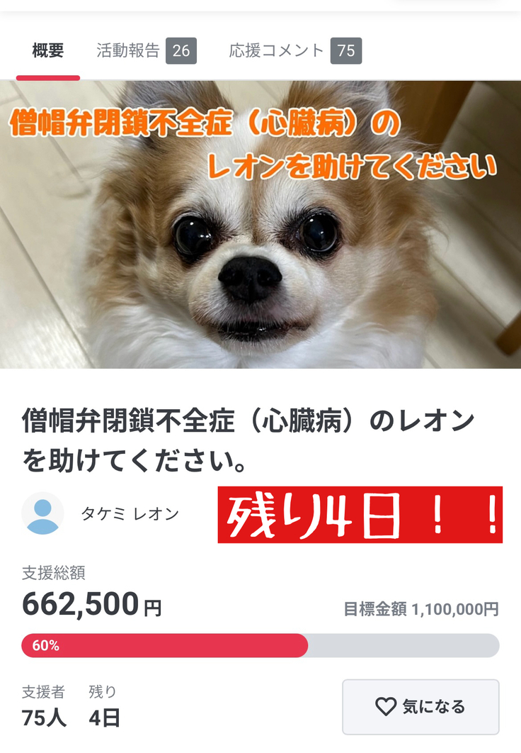※代理支援でいただいた支援金は、プロジェクトが不成立になった場合でも、返金せずレオンのこれまでの治療費に充てさせていただきます。