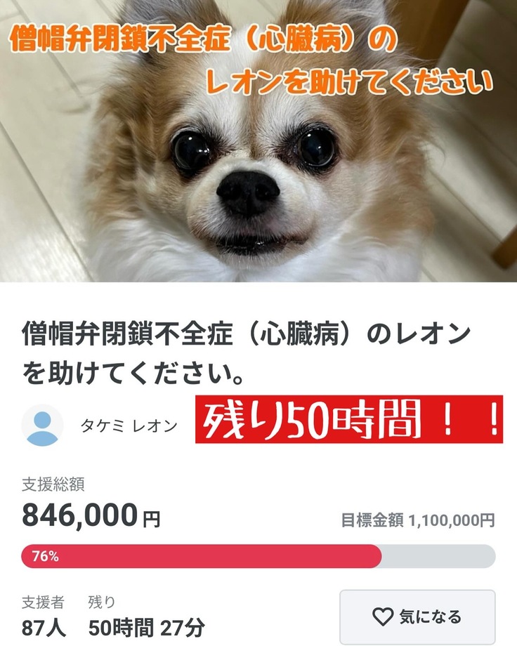 ※代理支援でいただいた支援金は、プロジェクトが不成立になった場合でも、返金せずレオンのこれまでの治療費に充てさせていただきます。