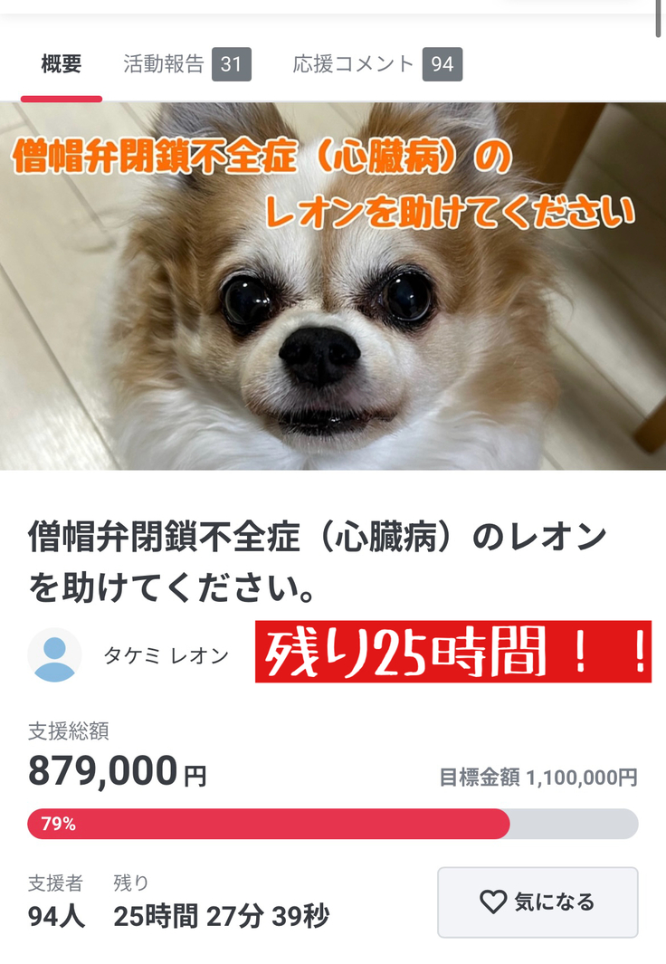 ※代理支援でいただいた支援金は、プロジェクトが不成立になった場合でも、返金せずレオンのこれまでの治療費に充てさせていただきます。