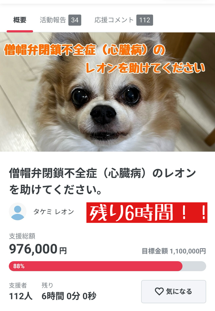 ※代理支援でいただいた支援金は、プロジェクトが不成立になった場合でも、返金せずレオンのこれまでの治療費に充てさせていただきます。