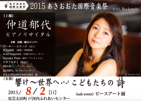 メイン演奏家には、日本を代表するピアニストであり、子供達の育成をライフワークとして活躍されている仲道郁代氏が来場予定です。また、ワークショップを通じて平和への思いを言葉にしたものと公募してくれた子供達の詩を元にアーサー・ビナード氏に監修頂きました。その詩をロス在住のMayuka Thaïs氏、Scott Nagatani氏、広島インターナショナルスクールの高校生、エリザベト音楽大学の学生によって作曲・編曲をしてもらいます。そうして出来た曲を、大人と子供で編成する合唱団が音楽祭当日に歌います。