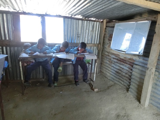 授業となると子どもたちも打って変わって真剣です。地震で校舎が崩れてしまったので、現在子どもたちはトタンの仮設校舎で勉強しています。夏は暑く、冬は隙間風でとても寒くなる仮設校舎ですが、子どもたちは暑さ・寒さにも負けず頑張って勉強しています。