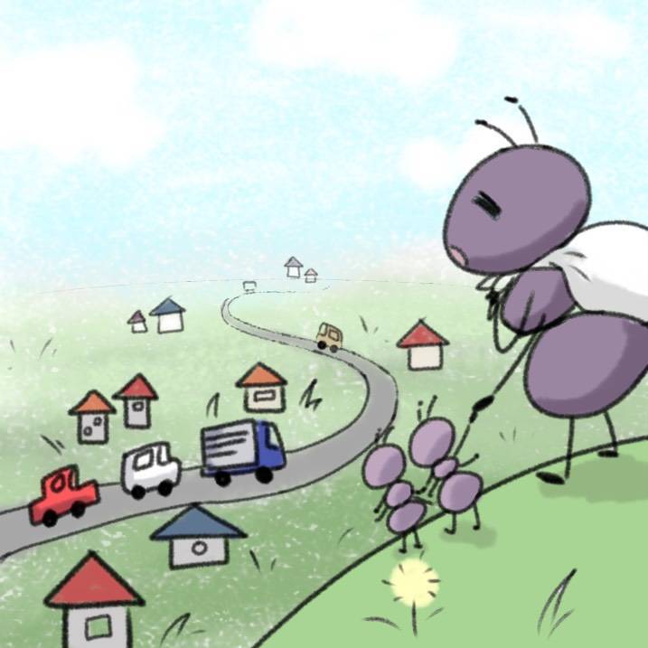 絵本のストーリーの主人公であるアリ母さんは、自由にのびのびと子どもたちをそだてていました。しかし人間が自動車を走らせることになって状況が一変。子どもたちが危険にさらされ、目を離すこともできなくなります。仕方なく引っ越しますが転居した先でも直ぐに車が走るようになります。