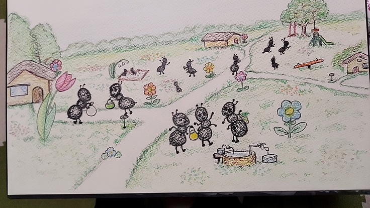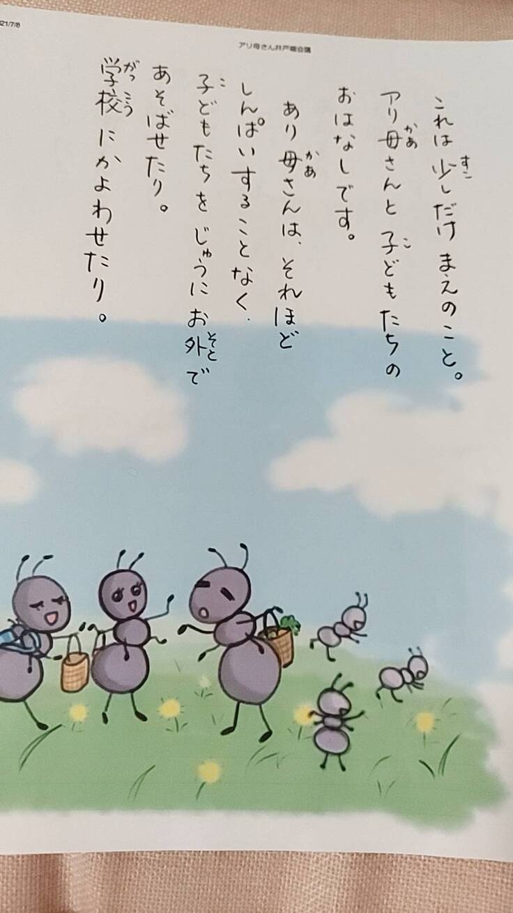 今、日本中の世界中の人たちが疲れて元気を振り絞って生活しています。子ども達も同じです。遊園地にも、プールにも行けなかった。おじいちゃんやおばあちゃんにも会えなかった子供たちに、それでもありがとうの言葉とニッコリすることの大切さをこの絵本の主人公のアリ母さんが届けてくれます。