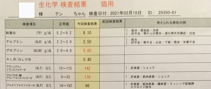 ※検査結果 A/G比0.5以下、FIPと診断されました
