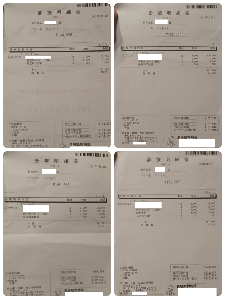 これまでの治療費と今後の治療費予定、体重の推移は下記の通りです。