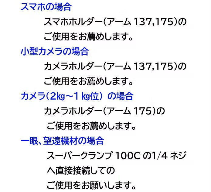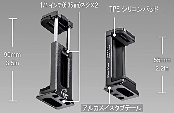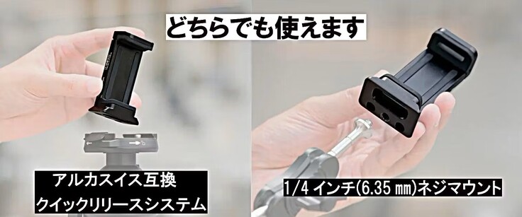※このパーツは、これだけの単品ではスマホ・カメラホルダーとしてはご使用になれません。ただし、例えばトラベル三脚の雲台のアルカスイス着脱でスマホホルダーとしてご使用の場合は、三脚にワンタッチでスマホをセットできるという意味で、単品でもご購入ご使用は可能です。