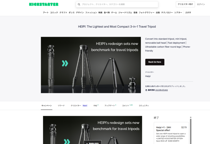 事の発端は、HEIPIが今の最新版の原型となるトラベル三脚W28のキャンペーンをアメリカのkickstarterとINDIEGOGOで世界に向けてキャンペーンを行ってるのを見つけた事から始まります。