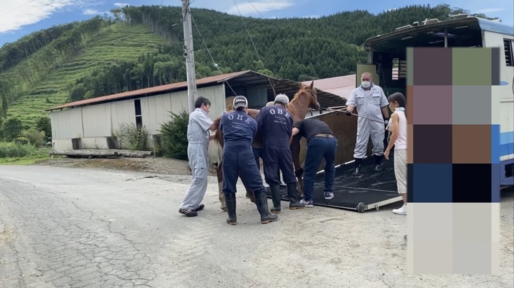 馬運車へ向かうライナーと、大江運送の皆様▼