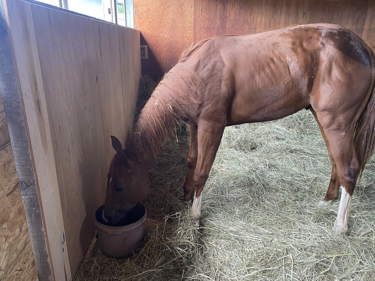 我が家の馬房に入ったライナーを見て、スタッフ様達が、脱水の心配、治りかけの擦り傷を心配して下さり、獣医師を呼んだ方が良いとアドバイスをして下さったので、獣医師にライナーを診察して貰いましたが、今日出来た傷は一つもなく、左前肢の砂のぼりが完治していない可能性がある、右後肢を痛めている可能性があるとの事でした。