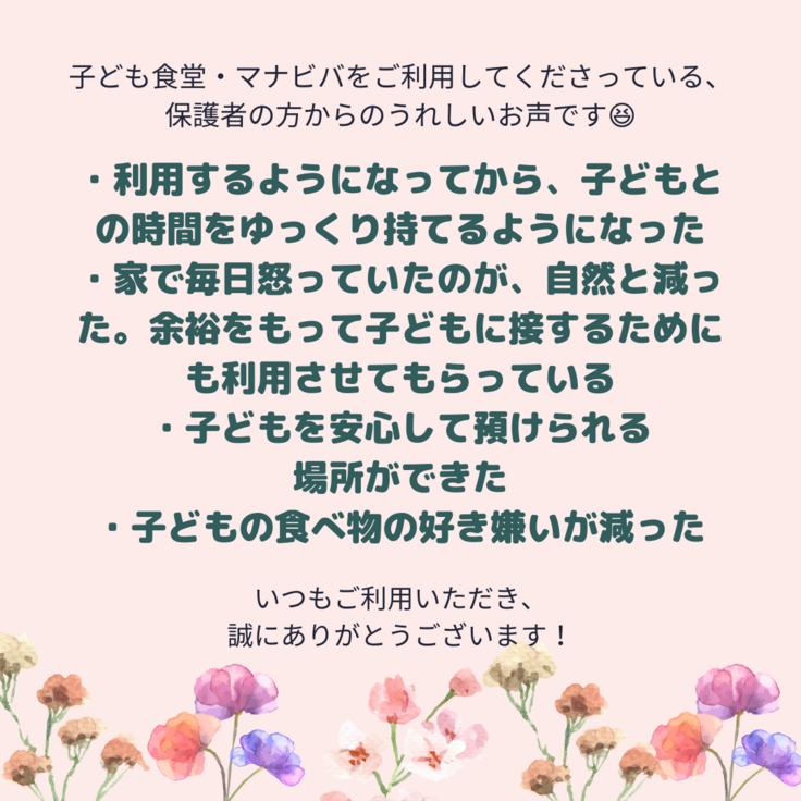 子ども食堂・マナビバをご利用いただいている、保護者様から頂いた、