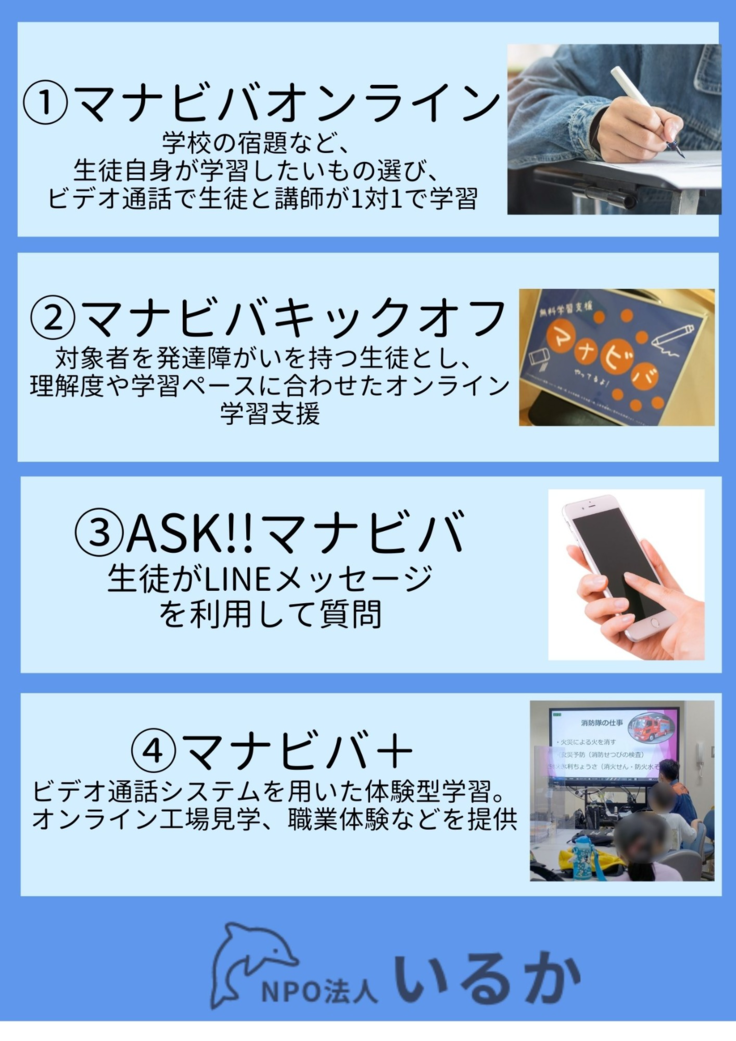 子どもの学力、特性、経済状況といった要因に関わらず、ひとりひとりがそれぞれのペースで学習し、力を伸ばし、将来を自分の意思で考え、実現していってほしい。私達NPO法人いるかは、こんな思いを持って学習支援事業「マナビバ」を行っています。