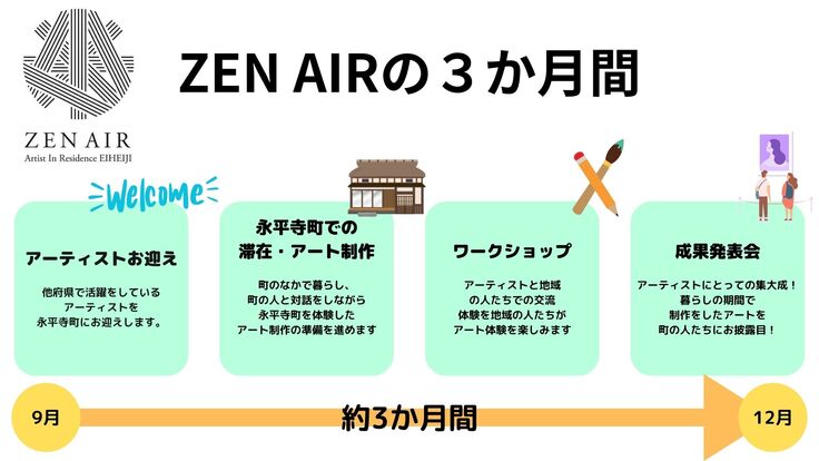 これらの活動の一環として、本年度、曹洞宗大本山永平寺を有する禅の里・福井県永平寺町で、「ZEN AIR -Artist In Residence」と題したアーティスト・イン・レジデンスを立ち上げました。