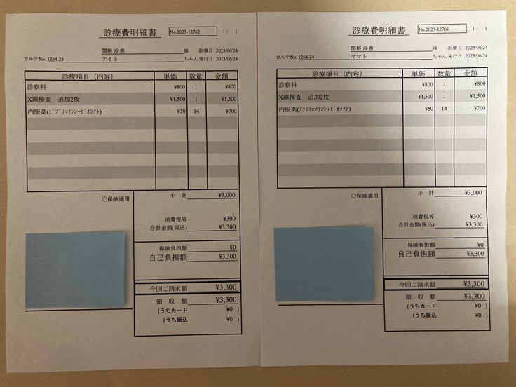 下記が今回の明細書です。母猫の抜糸代のものもついでに載せておきます。
