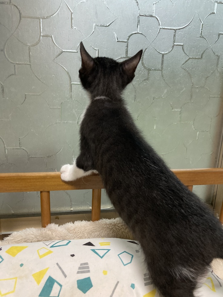 今日はゲリラ雷雨があり、家猫ちゃんのほとんどが怖がっている中、ナイトは音が気になるのか外を覗いていました。