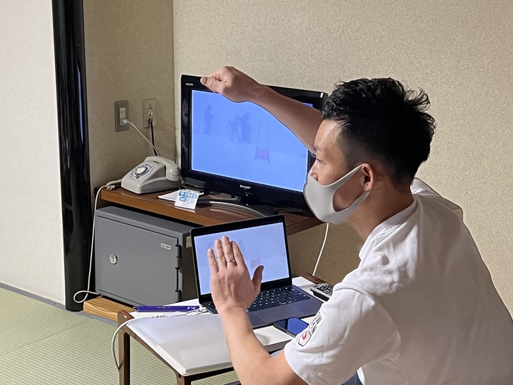 本日、雪上での練習を終えた後、コーチと選手たちが映像とともに振り返りを行っていました。