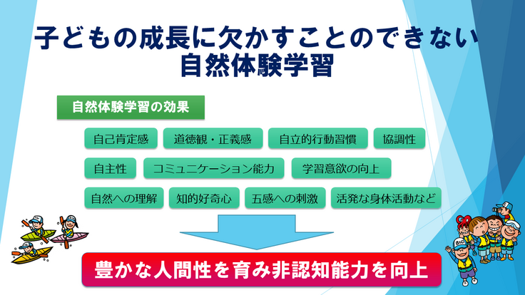 自然体験学習は、自尊感情や規範意識、コミュニケーション能力など、社会性や人間性を高める「非認知能力」の向上に効果があることが文部科学省などの調査で分かっています。