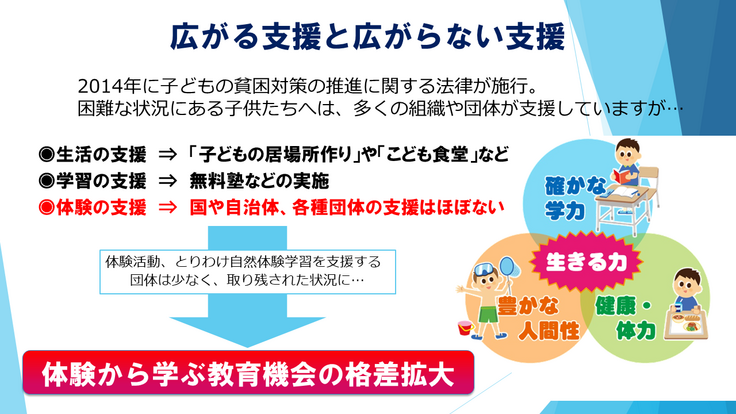 困難な状況にある子どもたちへの支援は、勉強(学習支援)や食事(子ども食堂、フードバンク)は自治体をはじめ企業や団体などが積極的に支援していますが、子どもたちの社会性を育む体験活動は「単なる遊び」と捉えられてしまい支援の輪が広がっていません。