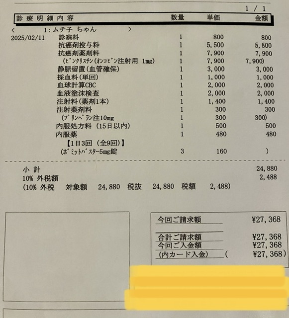 初めて知ったのですが、猫専用の抗がん剤は存在せず、人間用の抗がん剤を流用しているため、1瓶の5分の1とか10分の1とかしか使用せずに、残ったものは全廃棄らしいのです。そのため、用量増やしても治療費は変わらないということでした……。これを聞いて、