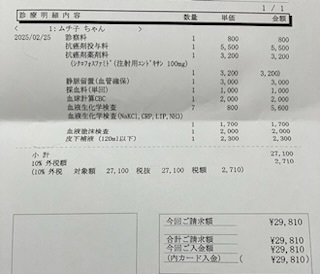 1ヶ月に1回は細かい検査が必要ということで、いつもより項目が多いのですが、今のところ腎臓や肝臓などへの影響はないとのことでした。