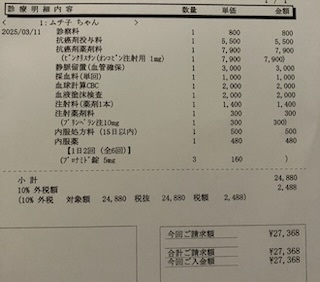 案の定、今日の通院でも体重は落ちていて、先生から「頑張って食べさせて!」と繰り返し言われました。200g減の2.8kgですから、これ以上は絶対落とせません。ムチ子も分かっているのかいないのか、夕食を少し食べてくれました。疲労と吐き気で苦しいだろうに、頑張ってくれてありがとう。