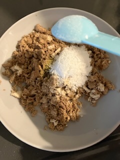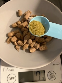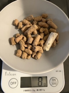 まず、ベースとなる総合栄養食はフィーラインナチュラルのラム&キングサーモンです。これはタンパク質:脂質:炭水化物=4:3:2に最も近い比率なので、今後も活躍して貰う予定のフードです。そこに、同じくフィーラインナチュラルのサプリ1粒。