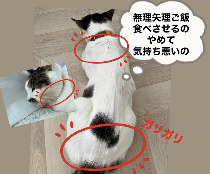 ムチ子は中毛猫なのであまり目立ちませんが、実際触ると骨の形がくっきり分かり、酷い痩せ方です。