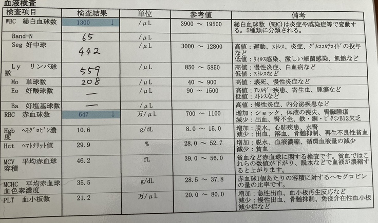 先週のものと比較して頂くと分かると思うのですが、揺れ幅が凄まじいです。先週の総白血球数は33800、好中球数29406でした。今週の好中球数は、死亡ラインの500を下回っています。これは4週間前のサイクロフォスファマイド投与時の最下点と並ぶ程低い値です。