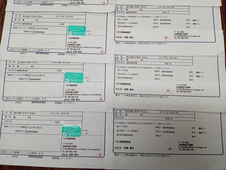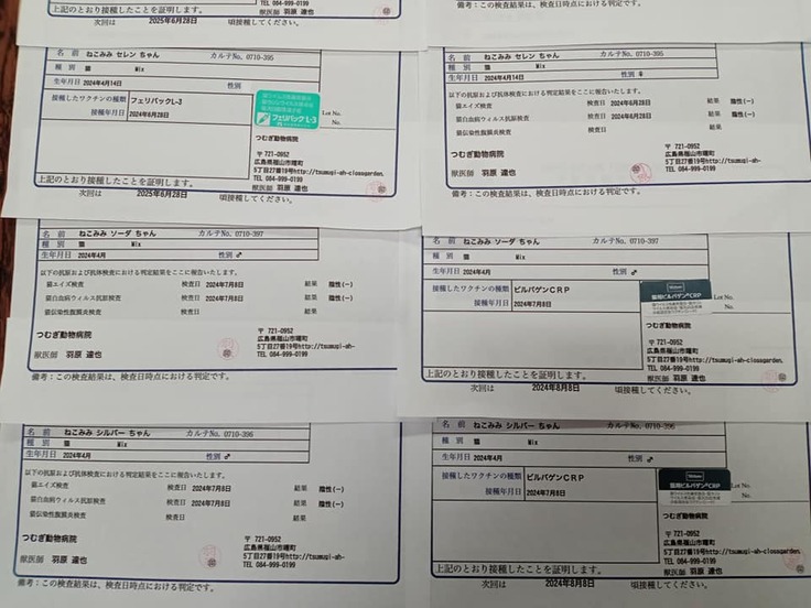 全員エイズ白血病陰性、検便もOK、ノミダニの駆虫も出来ています。