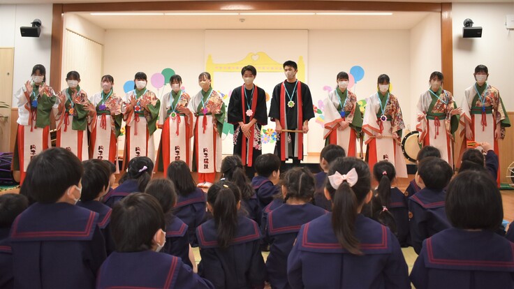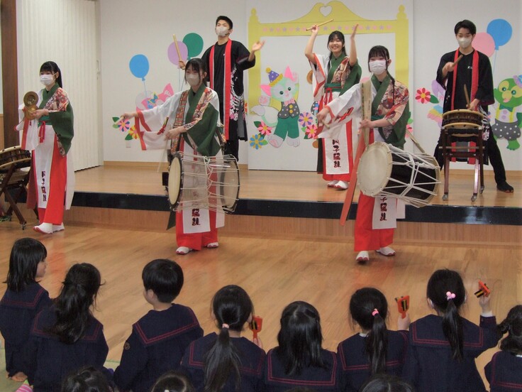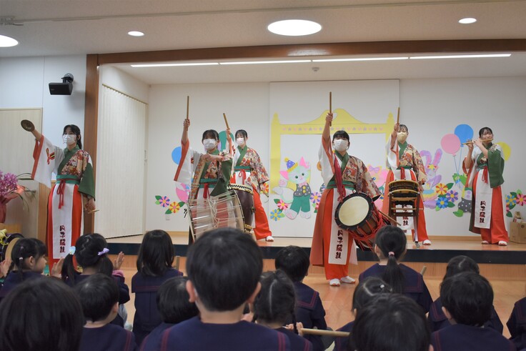 とてもきれいに飾りつけされた舞台と、かわいらしい「こんにちは~」の声に出迎えられて、部員たちはたちまち満面の笑顔です。さっそく2曲披露しました。「結」(ゆい)と「彩」(いろどり)という曲です。どちらの曲も音色の違う3種類の太鼓とチャッパと篠笛を使う、明るくて楽しい曲なので、子どもたちも手拍子をしながら元気いっぱいに聞いてくれました。