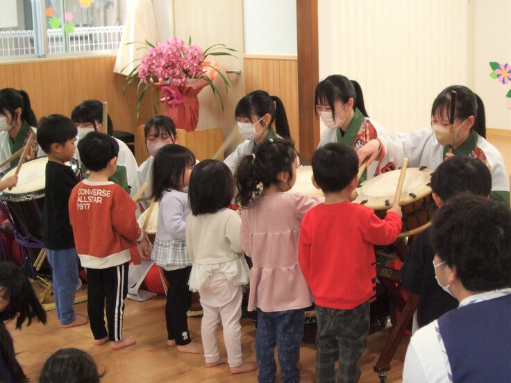 続いては、準備をしてきたお遊びコーナーです。鳴子を配ってカチカチ鳴らして楽しんだり、全員にバチを持ってもらって、10数人ずつ交代で前に出てきて太鼓をたたいてもらったりしました。子どもたちも実際に太鼓をたたいて音を出す体験ができて楽しそうでした。
