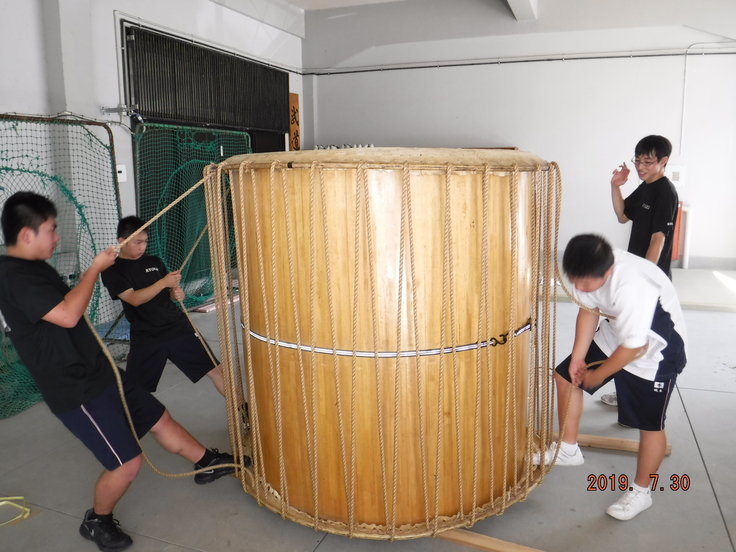 修理を控えた大太鼓ですが、下の写真は2019年に締め直しを行った時のものです。この時には革の傷みはあまり気になりませんでした。