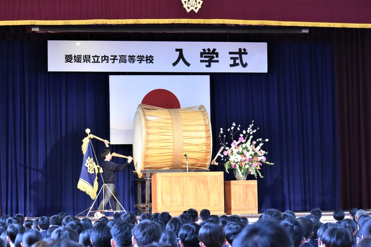 本日、4月9日、内子高校では入学式が行われました。緊張気味の新入生が体育館に入場し、着席と同時に緞帳が上がります。演台が少し邪魔(?)ですが、その奥に郷土芸能部の象徴である大太鼓が姿を現します。次の瞬間、大きな音が体育館中に響き渡り、約1分間の開幕太鼓が始まりました。