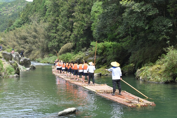 腹ごしらえが済んだところで、本日のメインイベント、「筏流し」の体験乗船です。意外と揺れたり滑ったりするらしくて、乗っている当人たちは景色をゆっくり眺める余裕はなかったようでしたが、新緑を映した川の上を筏が流れていく絵はとても綺麗で、ここでしか見られない貴重な景色を見ることができました。