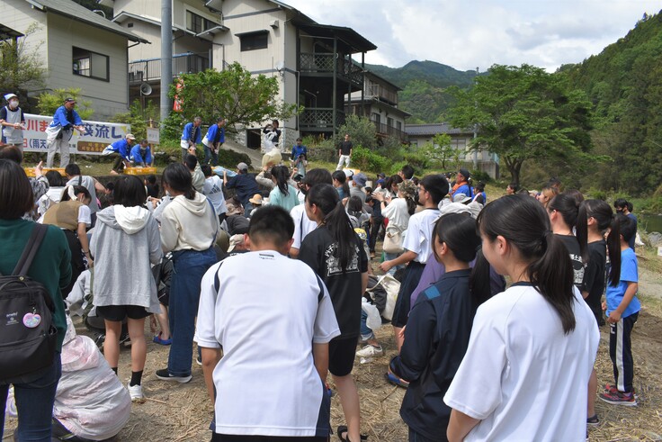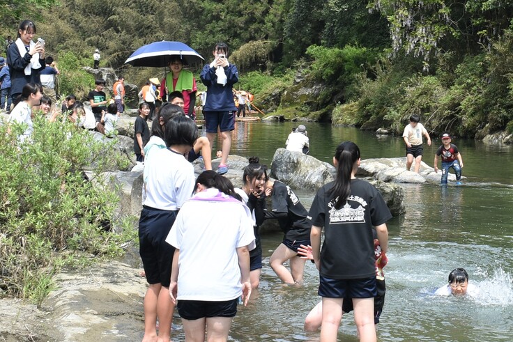 この後も、伝統を受け継ぐ筏師の皆さんによる「正調筏流し」や、小さな子どもたち対象の「宝さがし」と行事が続きます。宝さがしに参加できない小さくない高校生たちは、代わりに川に入って大はしゃぎ。童心に帰って楽しみました。