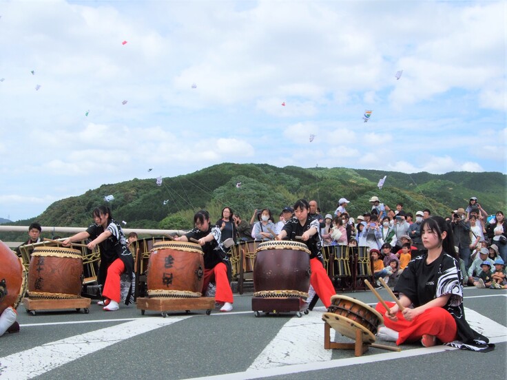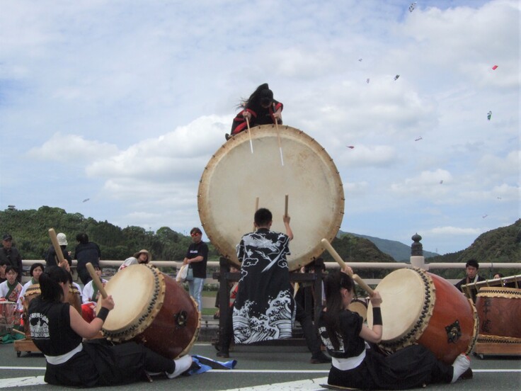 午後1時過ぎ、大凧合戦の開始に合わせて、「五十崎大凧出世太鼓」の演奏もスタートしました。豊秋橋の中央に陣取るその姿は、いつもより迫力がありました。その音も、いつもより深みがありました。最後の姿を目に焼き付けながら、最後の音を耳に焼き付けながら、大太鼓ヘの感謝の気持ちを込めて、この大切な曲を無事に演奏し終えることができました。観衆の皆様から盛大な拍手をいただき、感無量でした。