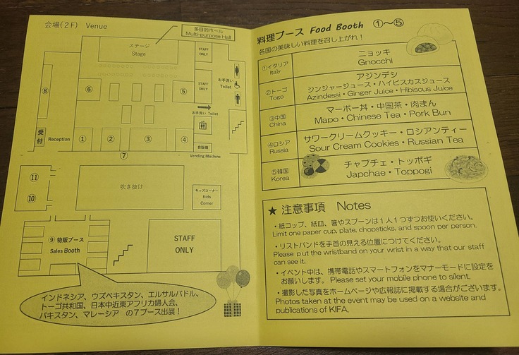 建物の入口では生鮮野菜やサツマイモスティックの販売、メインホールにはイタリア、トーゴ、中国、ロシア、韓国のお料理のほかにコストコ(!)のブース、その他にも今日は全館ほぼ貸しきりでKIFA のイベント展示や民芸品の物販のブース等もあります。