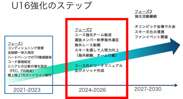 2030年、2034年の冬季オリンピックで日本人アルペンスキー選手が大活躍するためには、今現在U16世代の選手たちに対する長期的、継続的な強化プログラムがとても重要です。