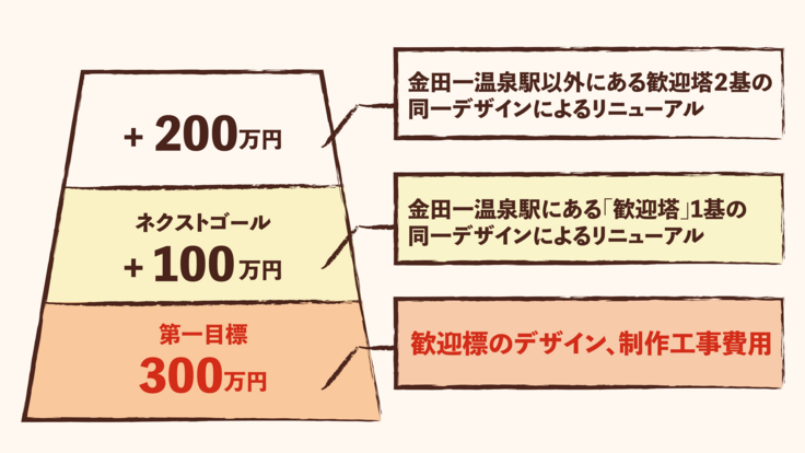 わたしたちは、引き続き「金田一温泉駅以外の国道4号、395号沿いにある歓迎塔2基の同一デザインによるリニューアル」を目指し、サードゴールとして「600万円」を掲げ挑戦を続けさせていただきたいと思います。