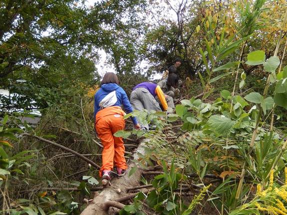 倒れた大木を利用した遊具に乗ったものの降りられない・・・。