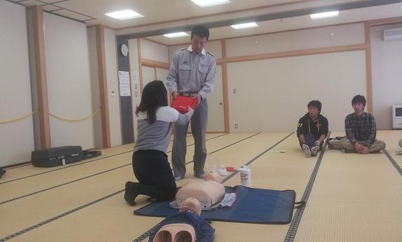 今日は普通救命講習会があり、地元大学生達と一緒に受けました。