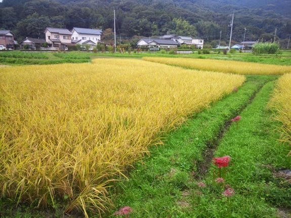 夏場、あぜには旺盛に草が伸びてきます。田んぼの中の草取りとともに、このあぜの草刈りが大変な重労働です。毎日2時間は草刈りに費やされます。傾斜地での草刈は腰に大きな負担となってきます。猛烈な汗をかきながらの草刈りをしたら、また猛烈に汗をかきながらその草を集めて運び出します。